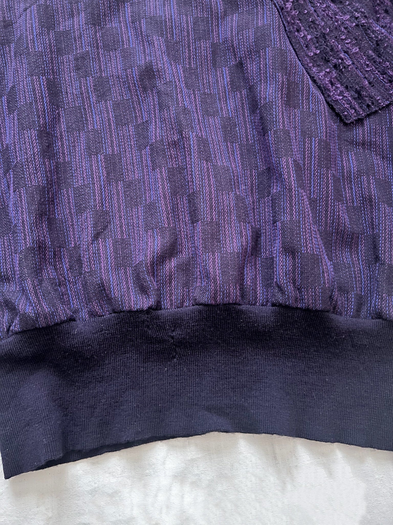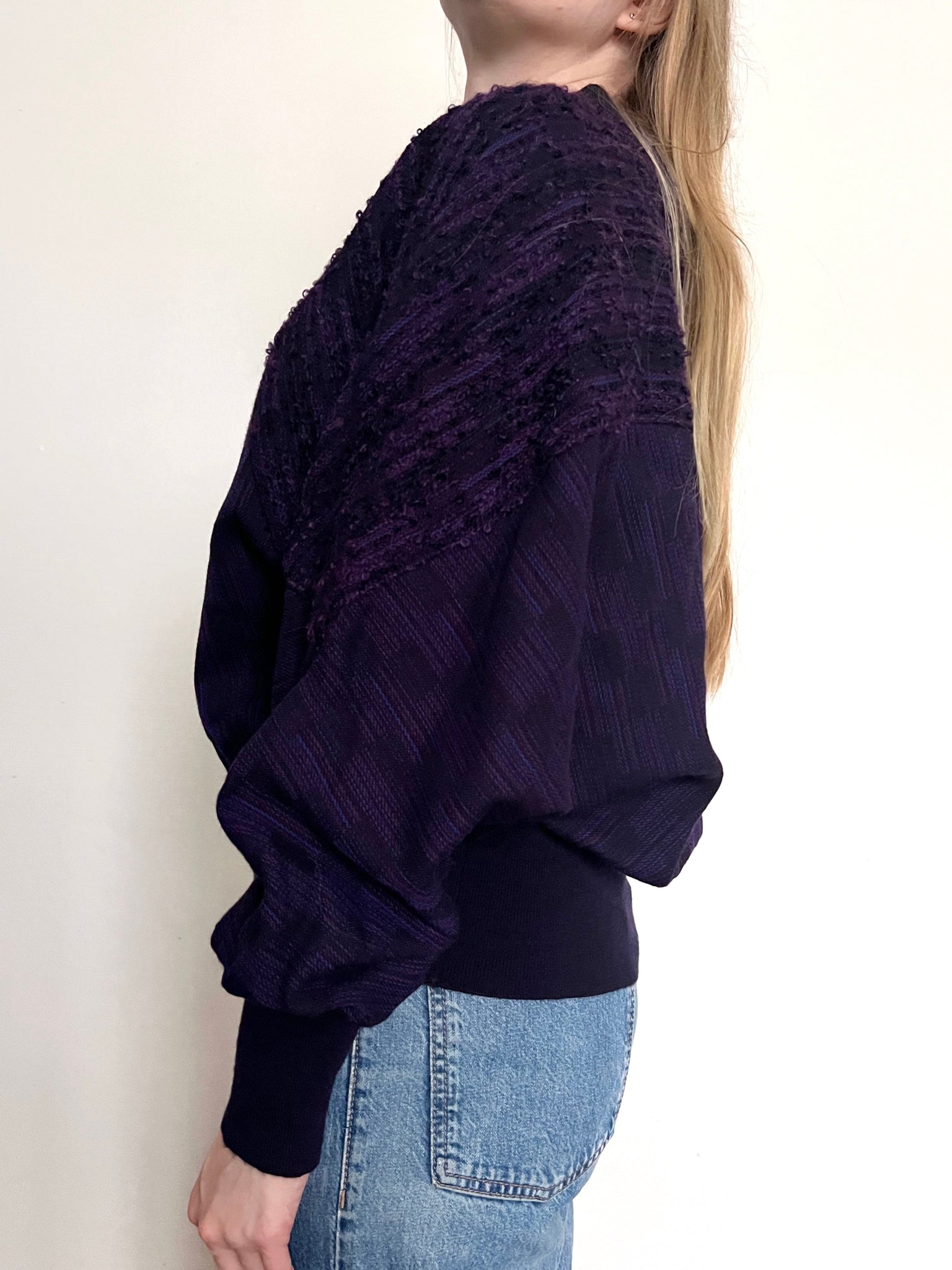 A purple sweater with a relaxed fit. The sweater has a mix of textures, the main body has a subtle woven pattern, while one shoulder, sleeve panel, and part of the back are made from a chunkier, boucle-like fabric that adds depth and contrast. The neckline, cuffs, and hem are ribbed. The sleeves are full and voluminous, gathering at the fitted cuffs.