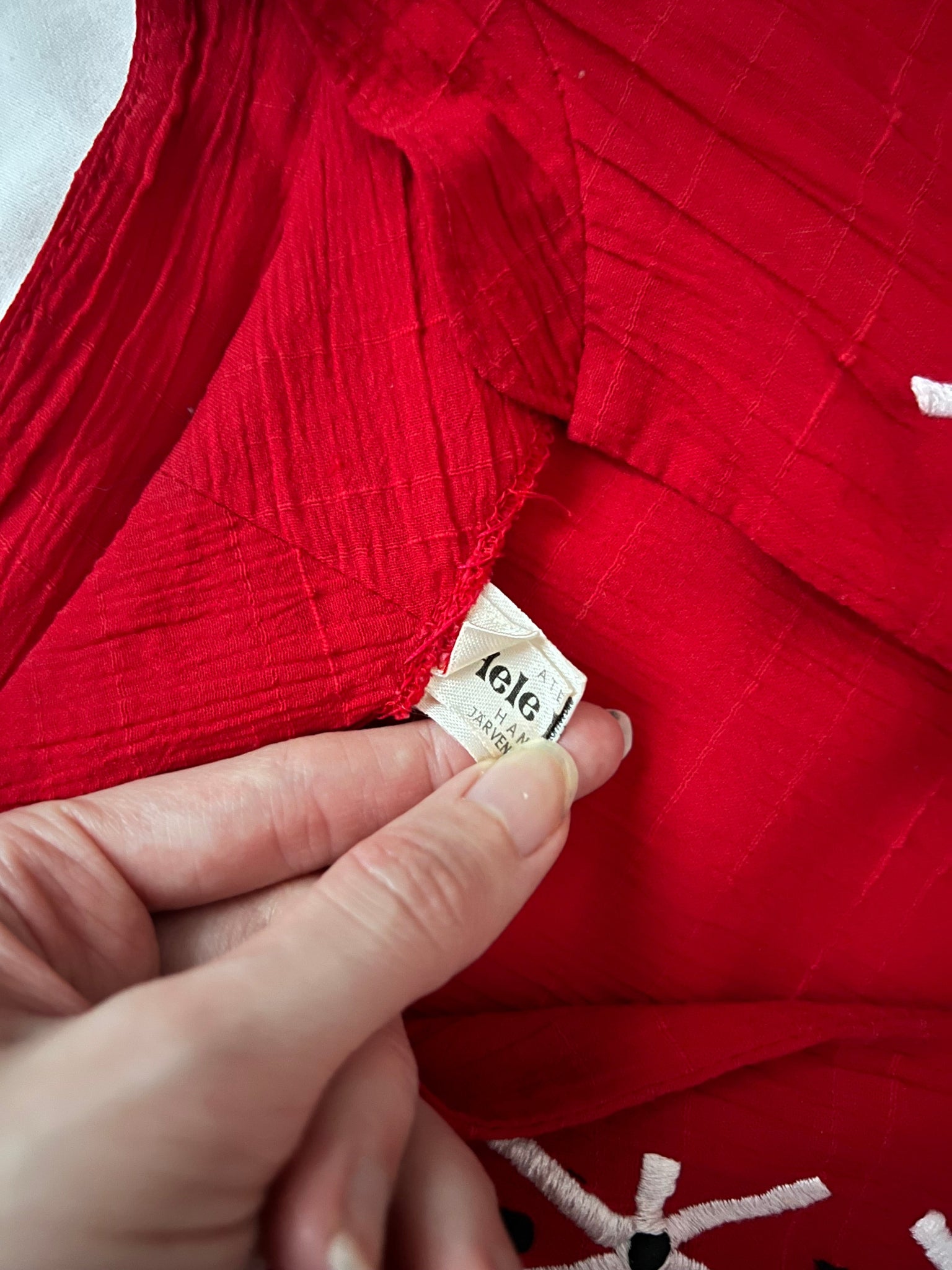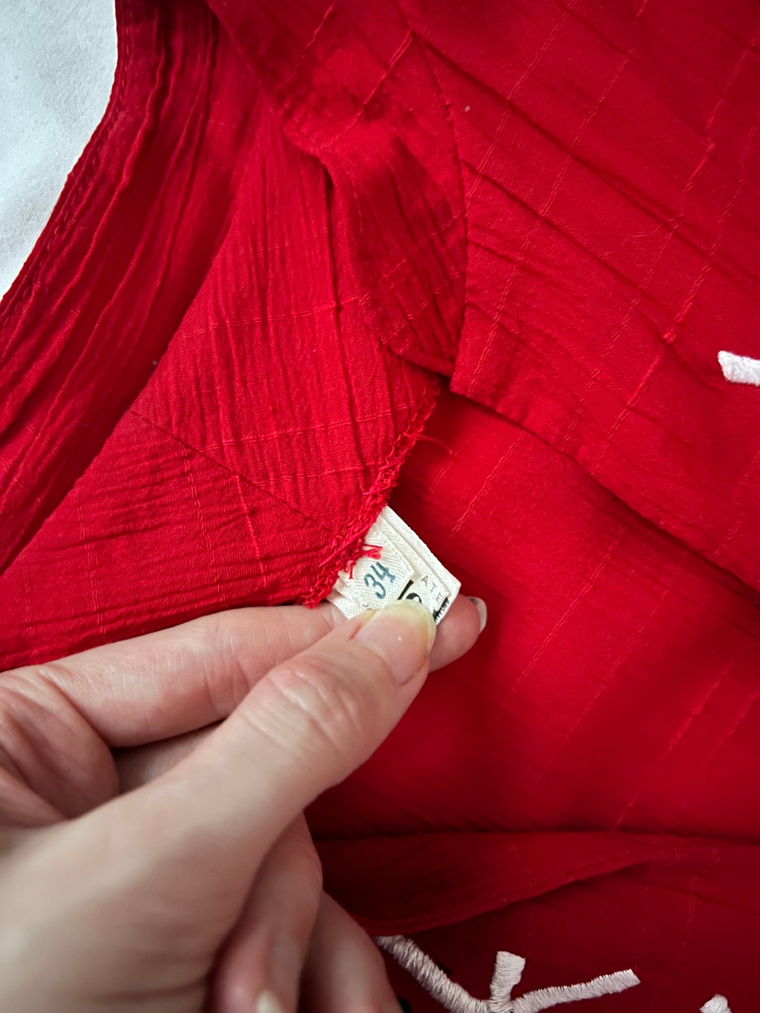 A red flowing dress with a V-neckline with white embroidered motifs and black dots around the neckline. The dress has embroidered trim on both the front and back of the dress. The same fabric trim is is used to tie a bow in the back. The sleeves are three quarter length and are gathered at the cuff.