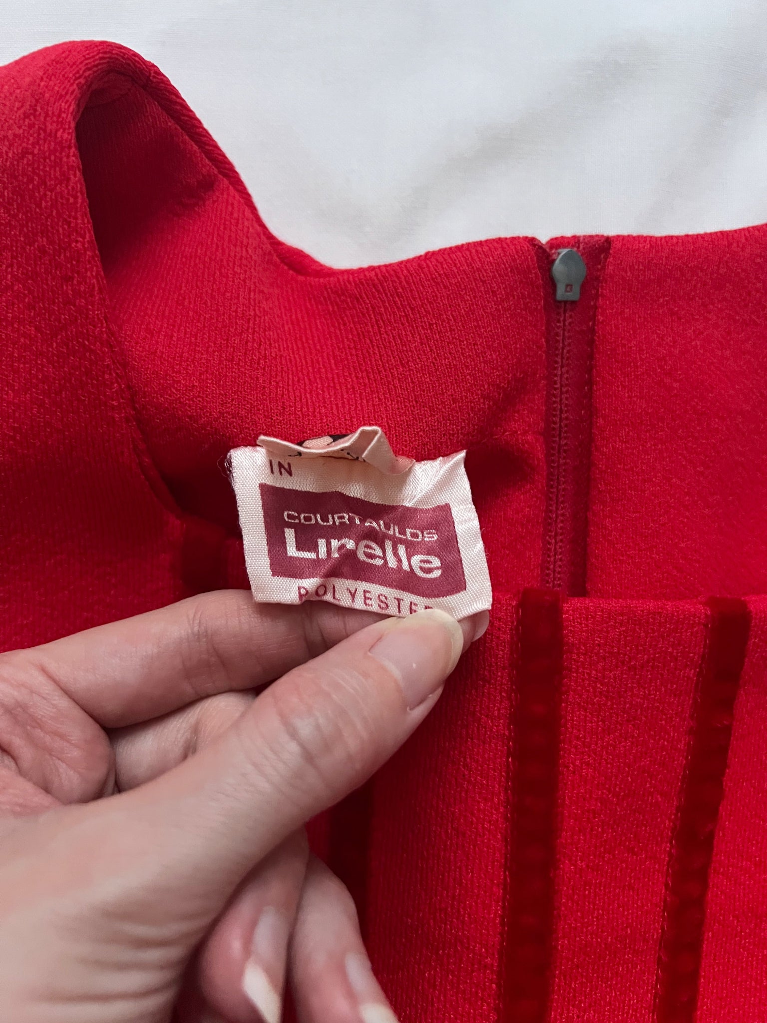 A red maxi dress with a square neckline, and short puffed flutter sleeves. At the bodice there is a panel of darker red velvet stripes. The dress has a back zipper.