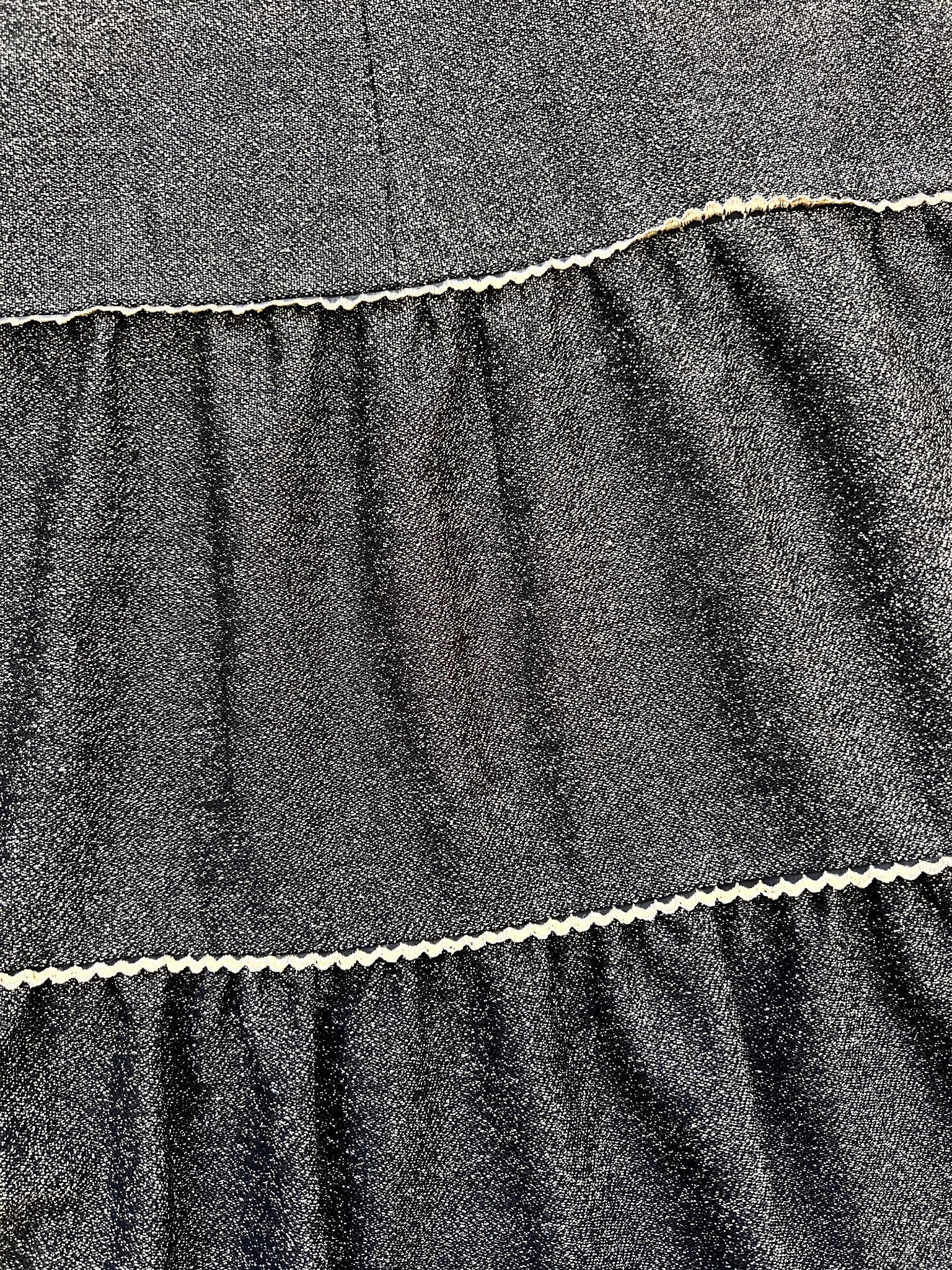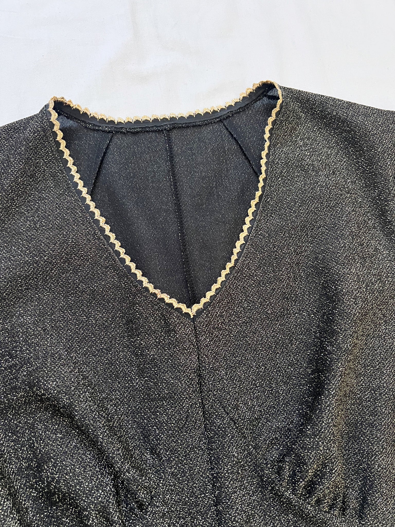 A mid length shimmery dress. The dress is made from a shimmery dark fabric that has a subtle metallic sheen, the bodice has a V-neckline with gentle gathers at the bust. The neckline, sleeve cuffs have a gold calloped edging that also appears along the tiered skirt seams.