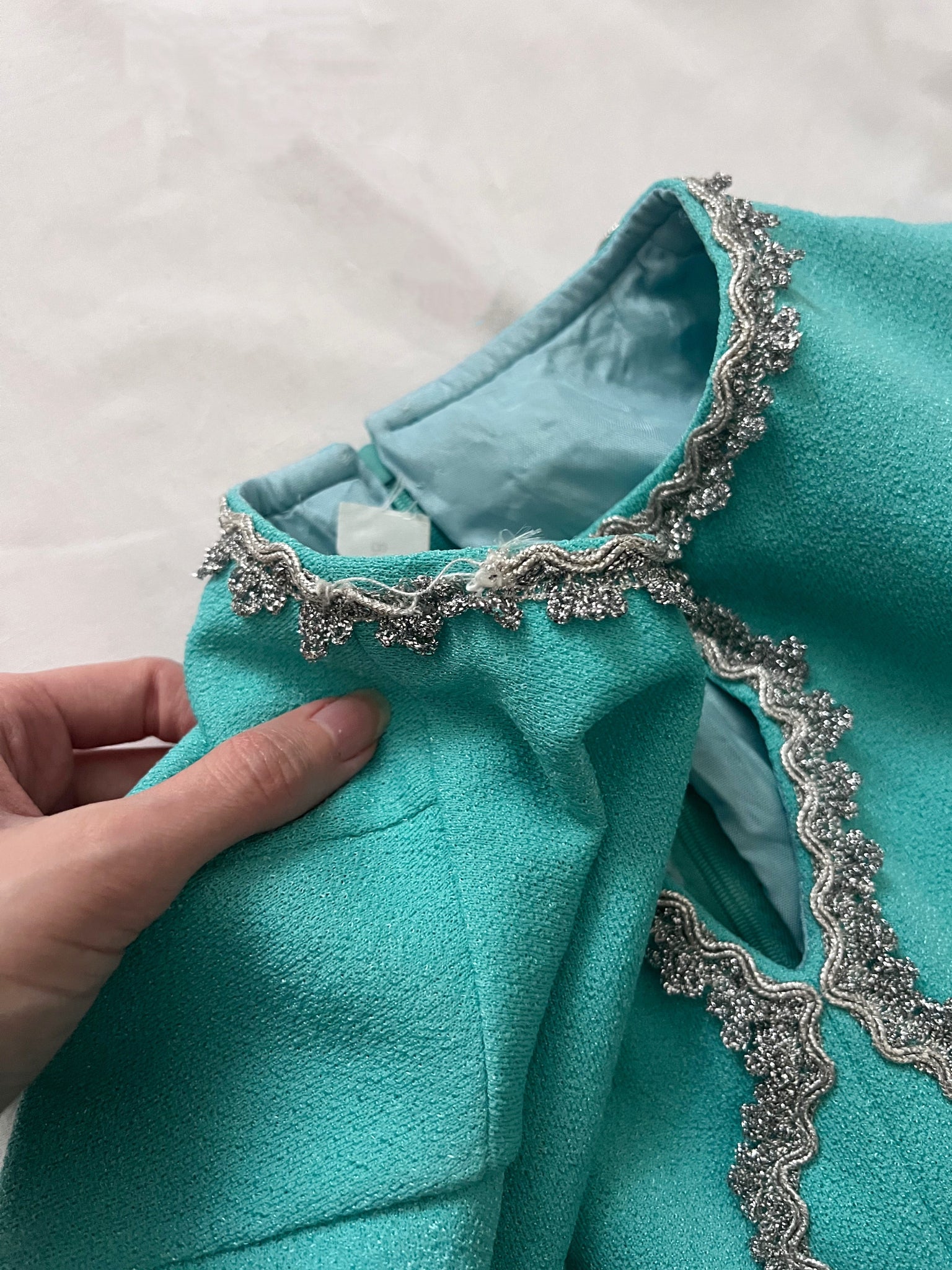 A turquoise knee length dress. The dress has cap sleeves, a teardrop-shaped cutout at the neckline framed by a silver lace trim that runs down the center of the bodice in a wavy, symmetrical pattern and also goes around the whole neckline. The dress has a back zipper.
