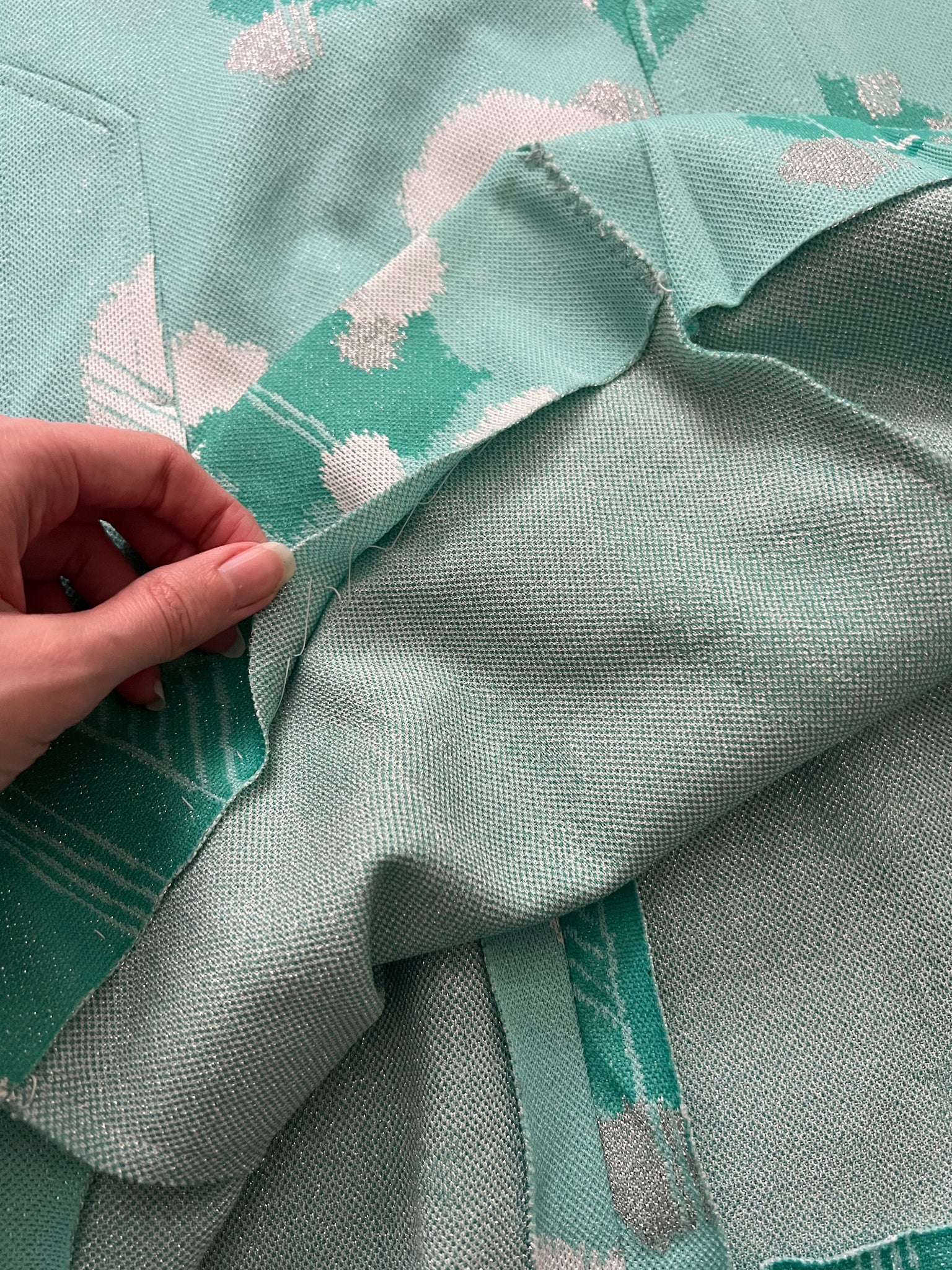 A turquoise sleevless dress with a fitted bodice that flares out into an A-line skirt. The dress has a pattern of abstract shapes in white, teal, and silver with a subtle sheen from silver glitter woven throughout.