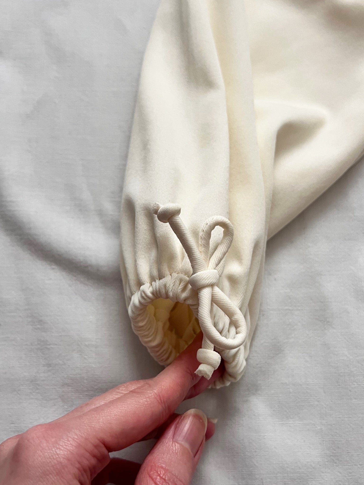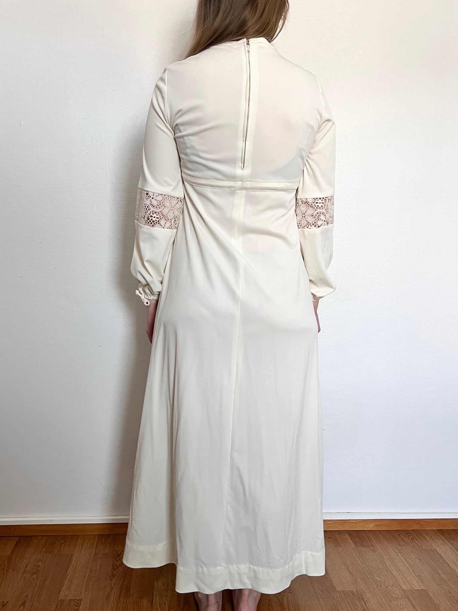 A white long sleeve maxi dress. the dress has a high neckline with a small keyhole opening. The upper bodice has lace panels across the chest, the same lace is also at the sleeves. Below the bust there is a drawstring tie that alows the waist area to be sligtly adjusted and creates an empire waist silhouette. The dress has a back zipper.