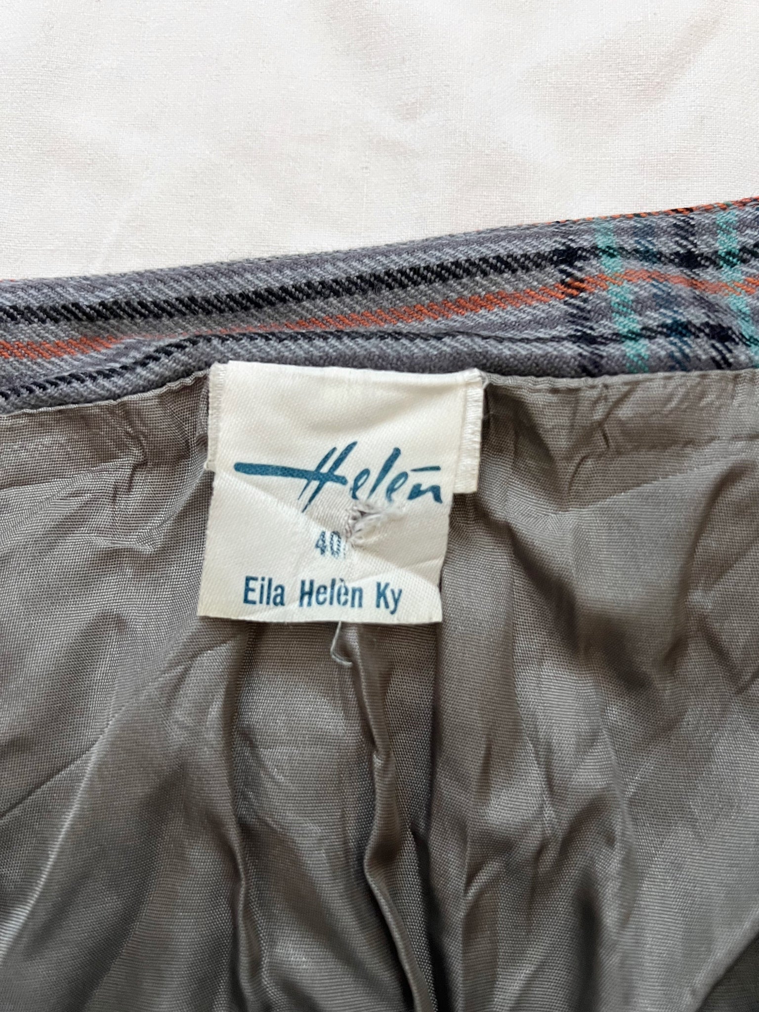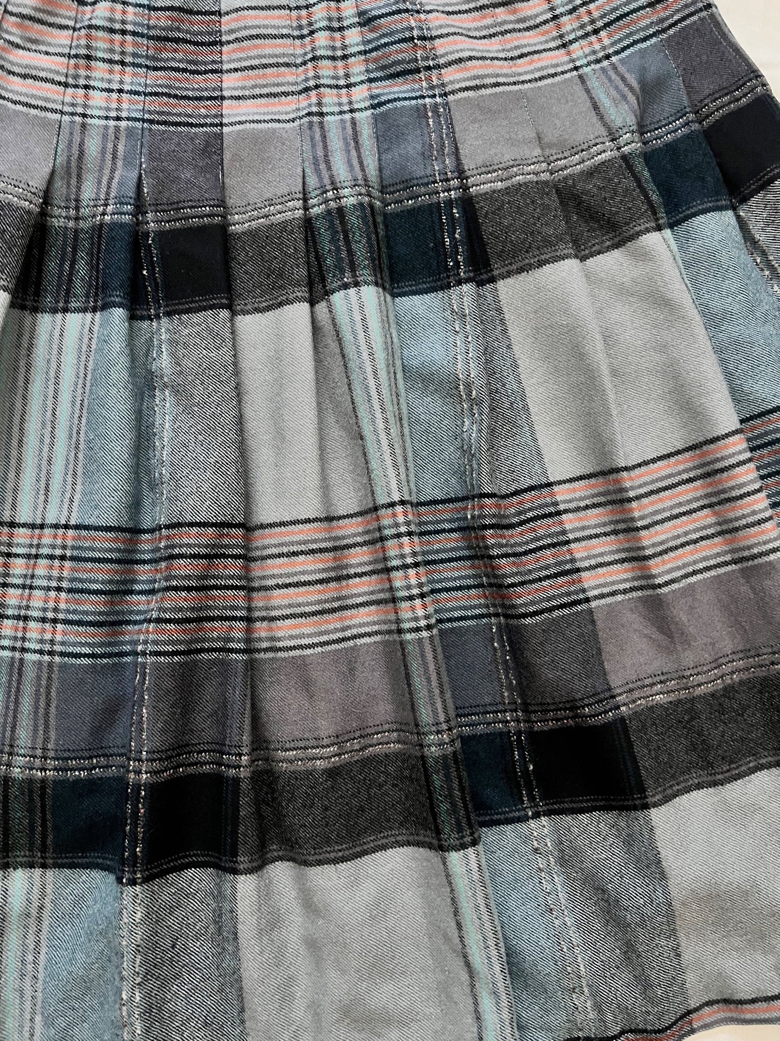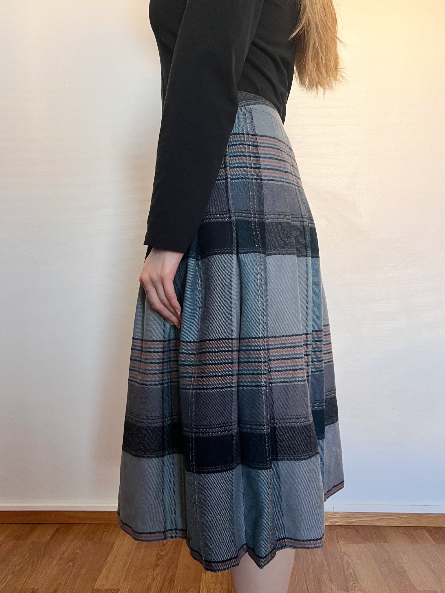 A midi length A-line skirt with a plaid pattern in blue, gray, and black, with subtle accents of red and green lines creating a soft, classic tartan look. The skirt has pleats, inside lining and a zipper.