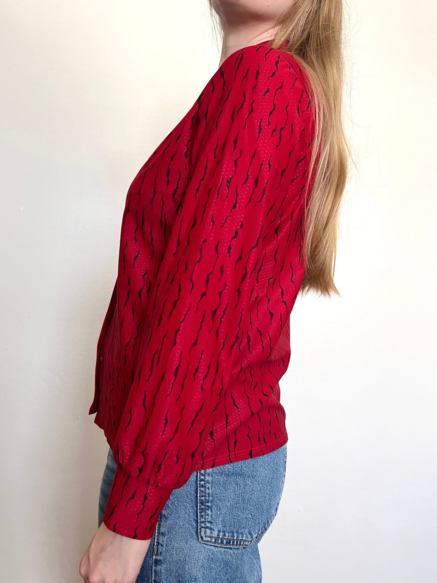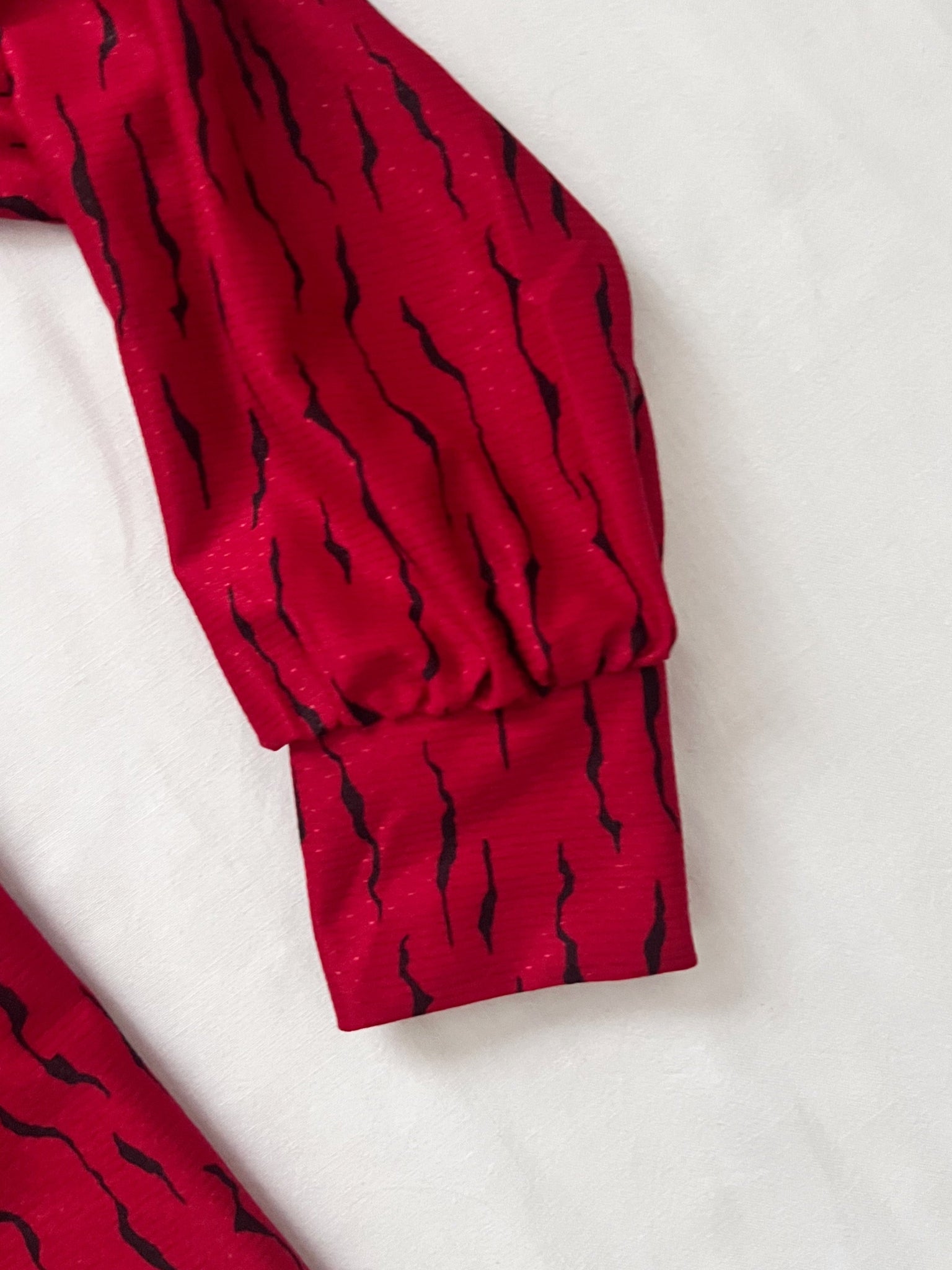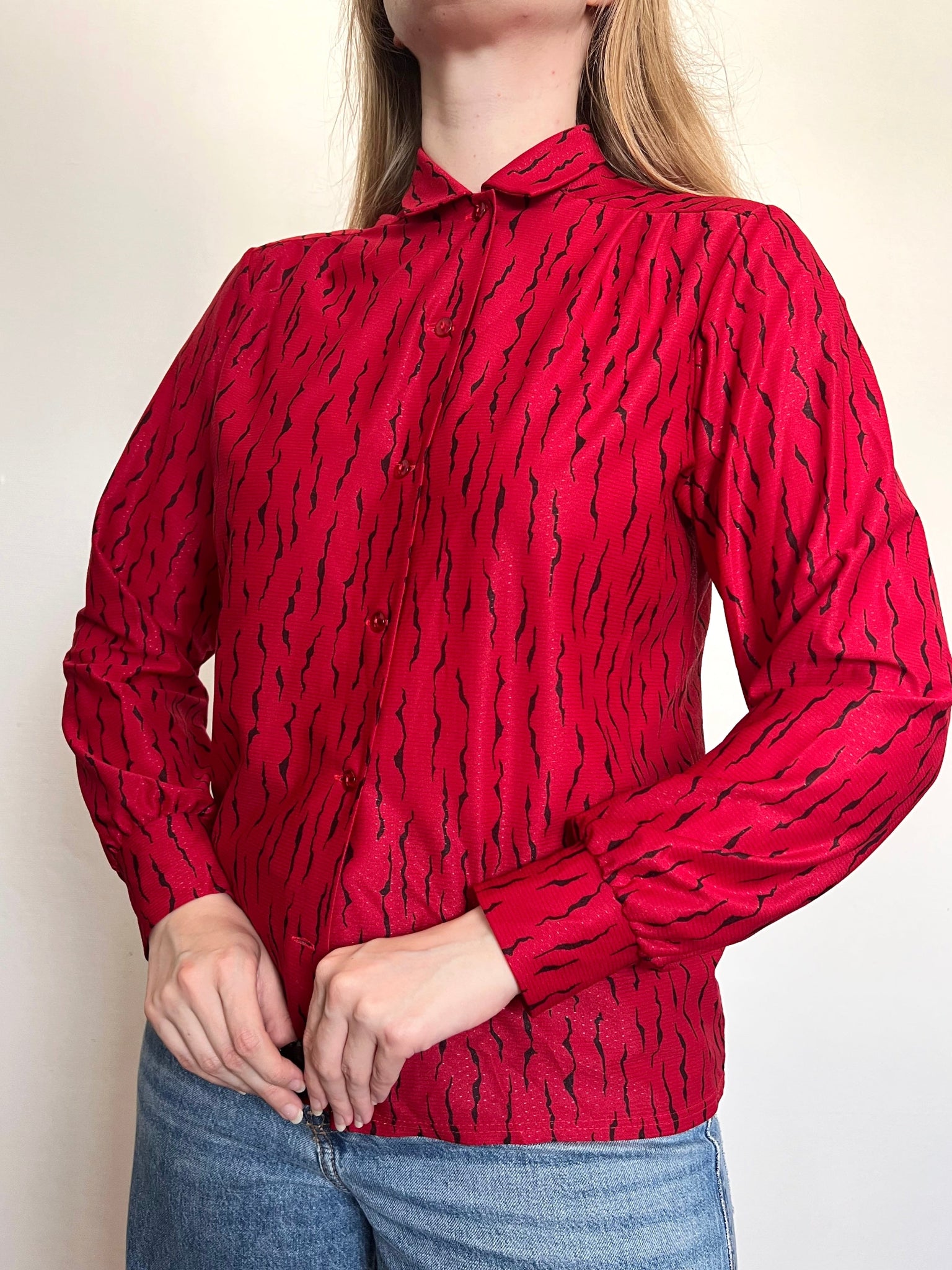 A red shirt with with black wavy stripe pattern that create a flame like look. The shirt has a classic pointed collar and long sleeves with buttoned cuff. The fabric has a subtle sheen,