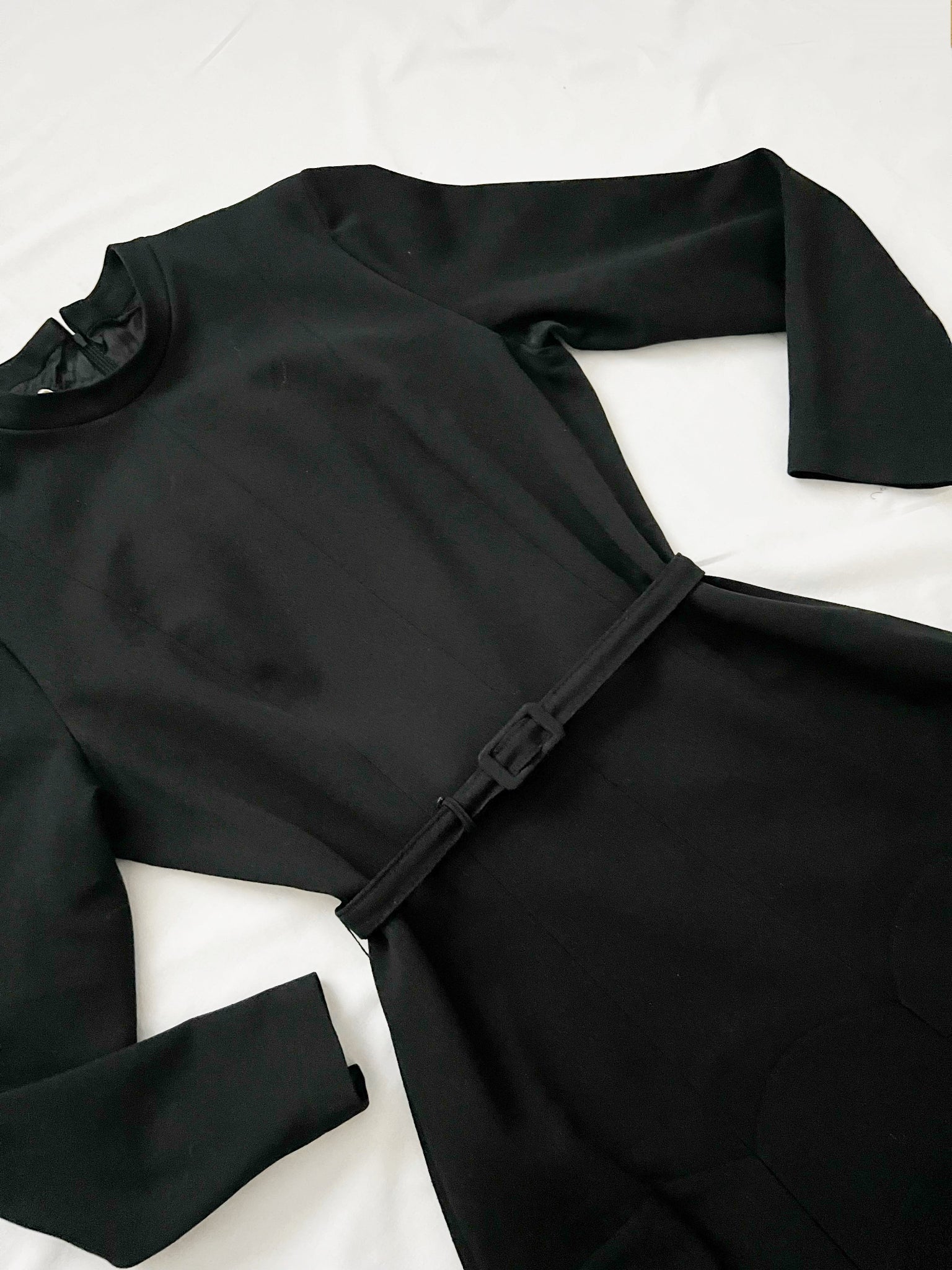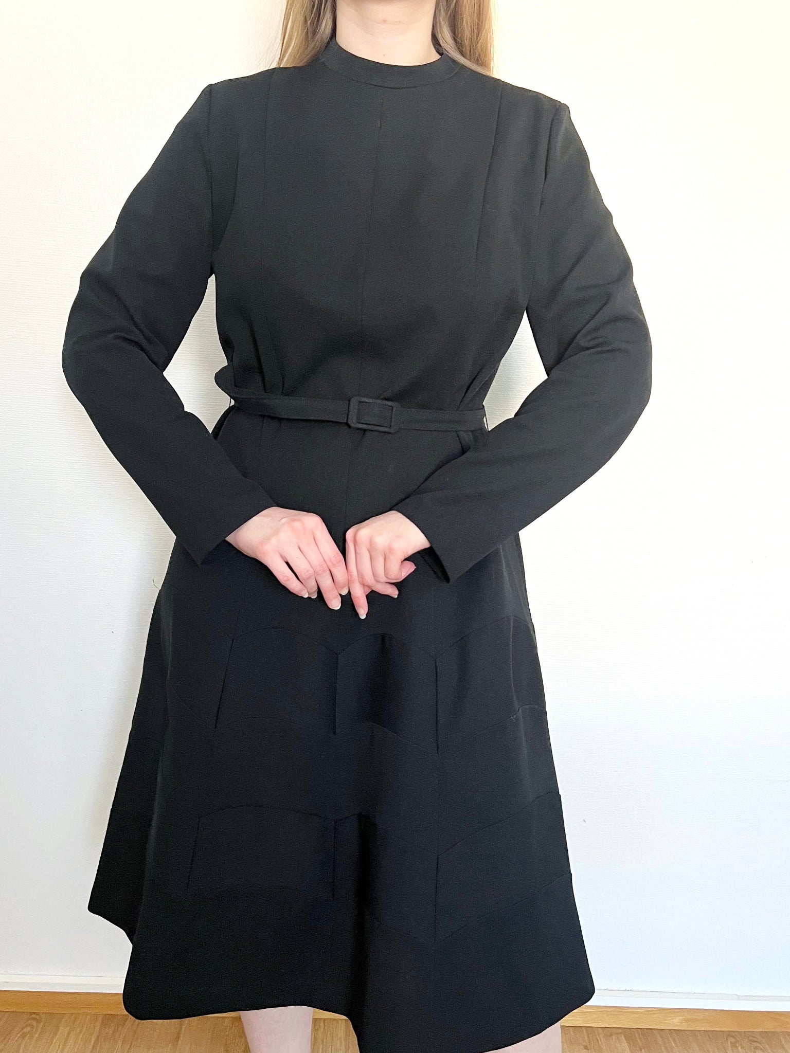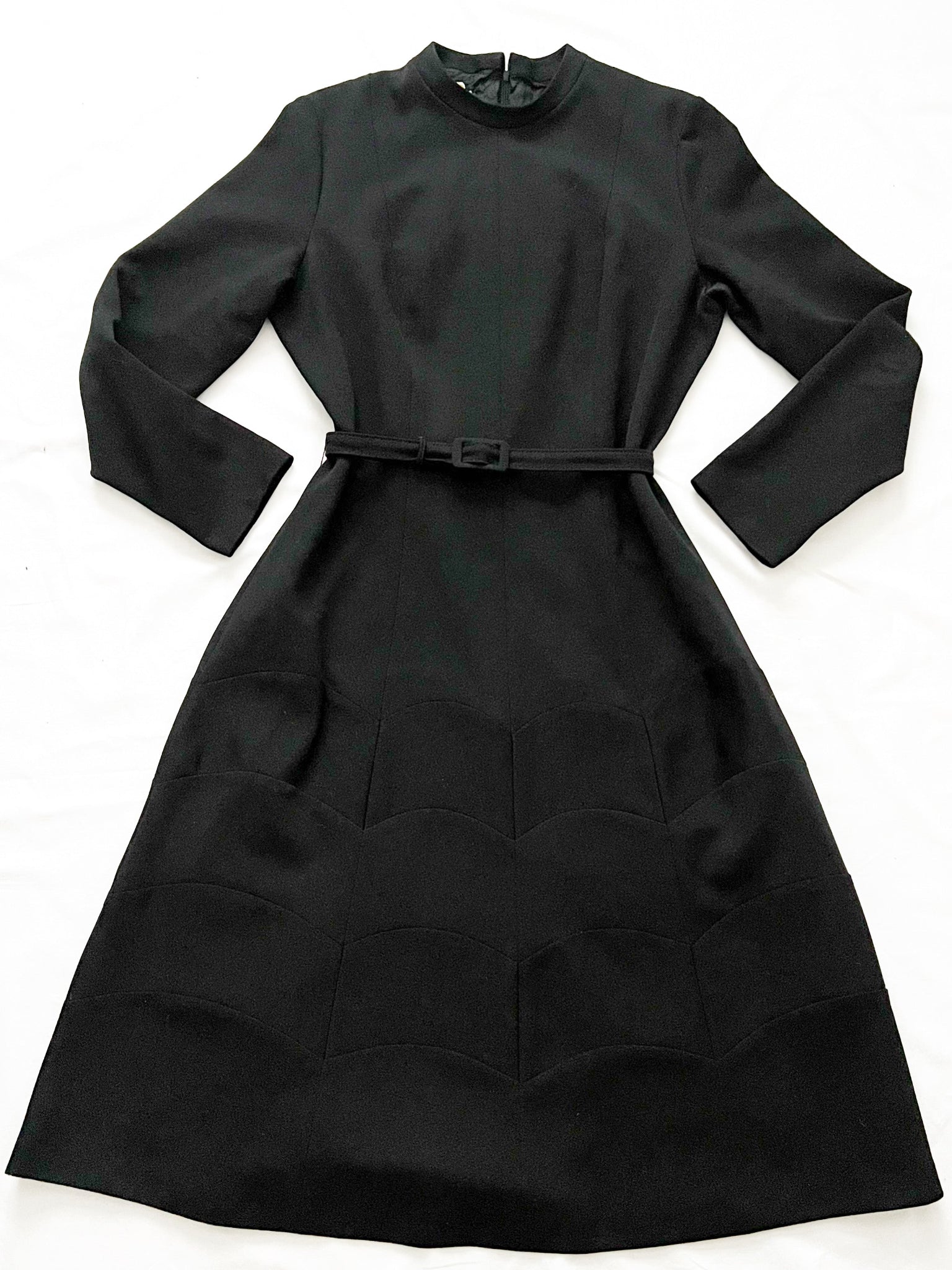 A black, long sleeved dress with a matching black belt and scalloped pattern at the skirt part of the dress. The dress has a back zipper.