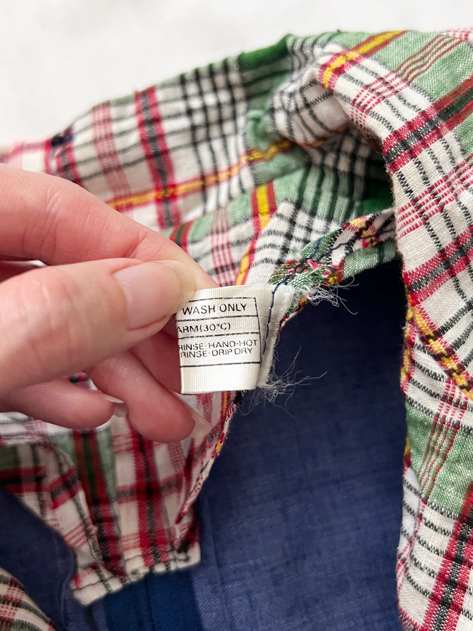 A blue knee length short sleeved dress with plad fabric accents at the cuffs, and around the neckline. The dress has a belt that ties to a bow in the back and a back zipper.