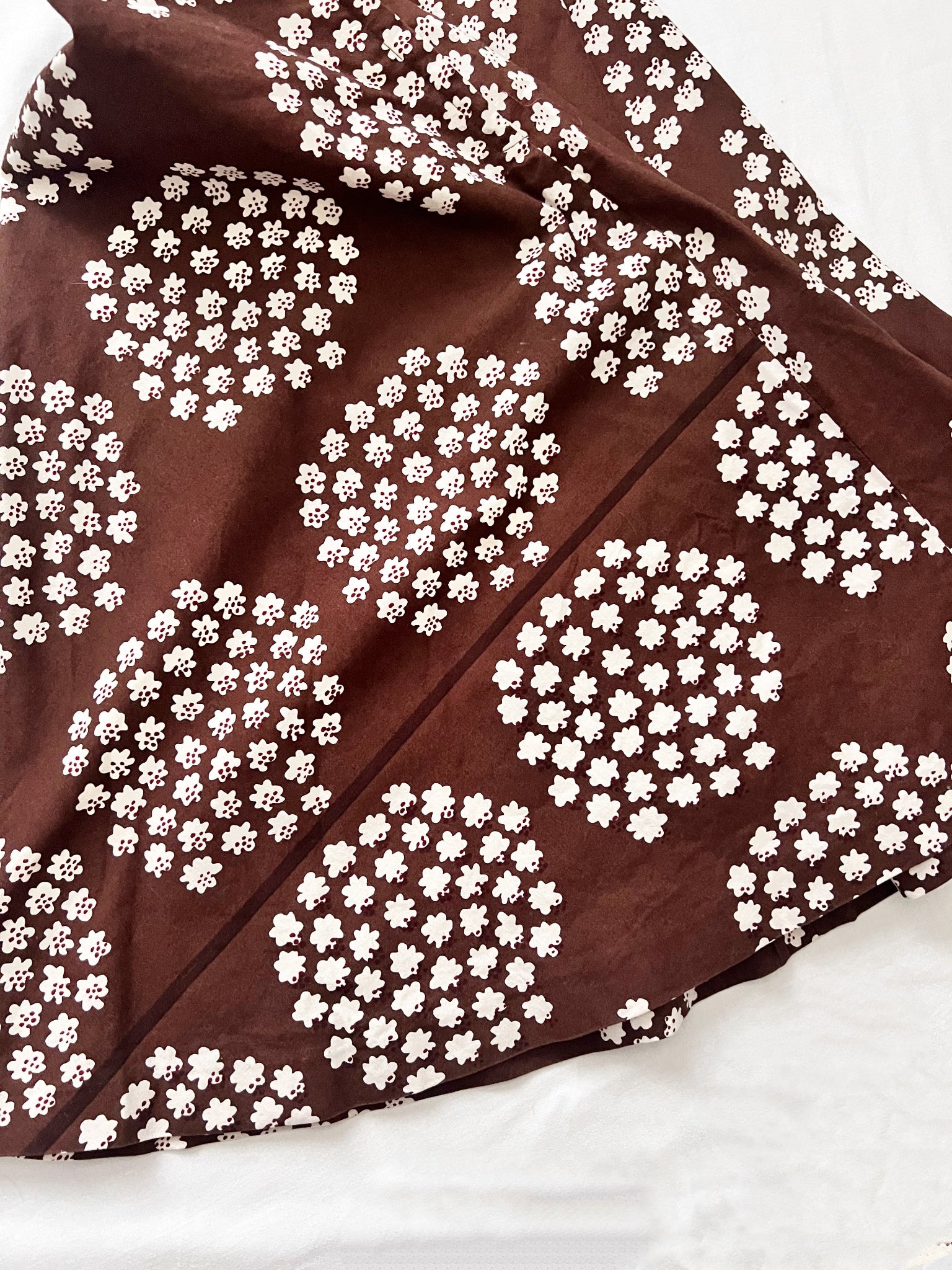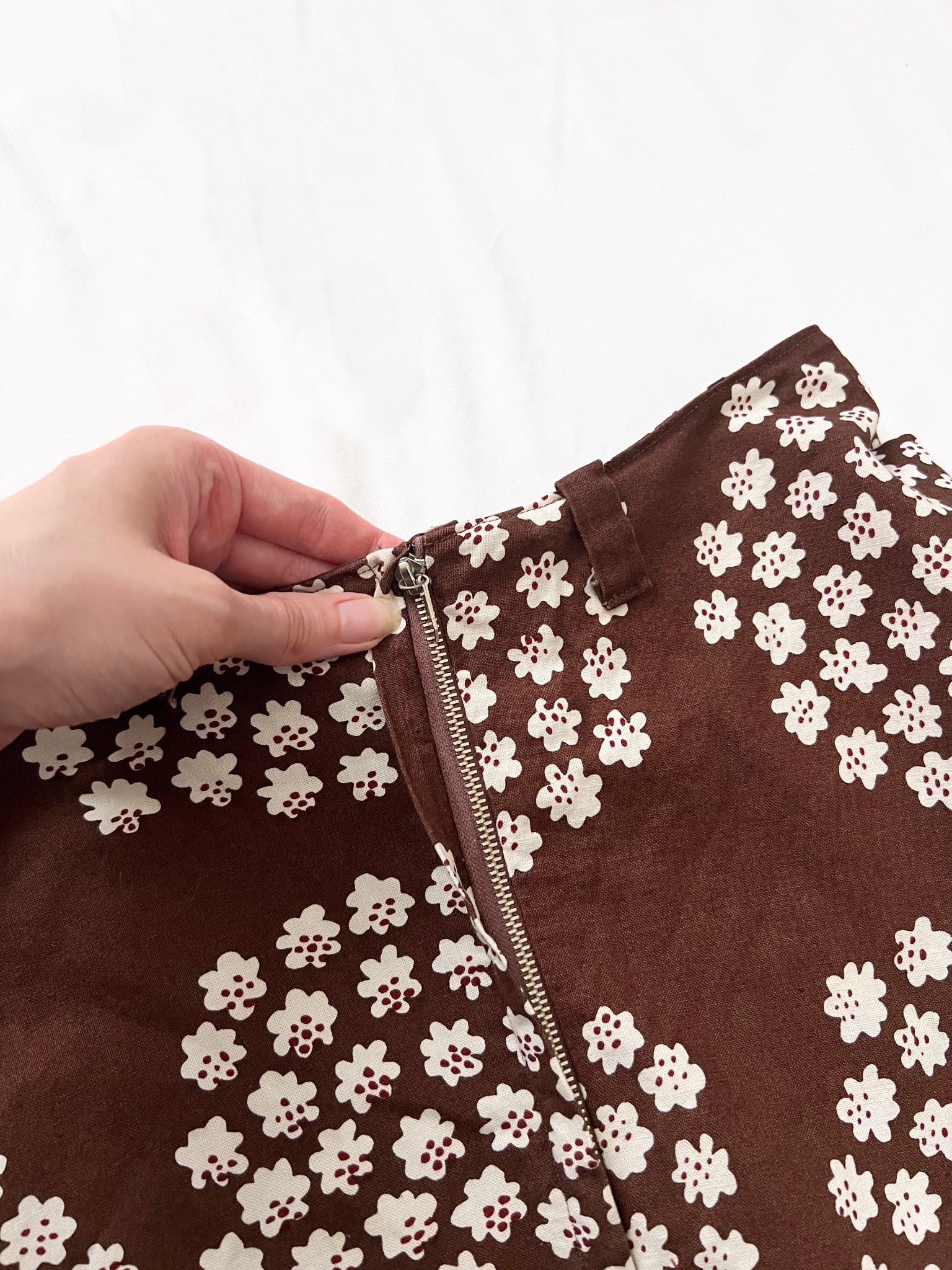 A brown skirt with a pattern of white flowers in circles, and with a zipper. The fabric has a darker brown line that I'm unsure if its part of the design or an error when the fabric was printed.