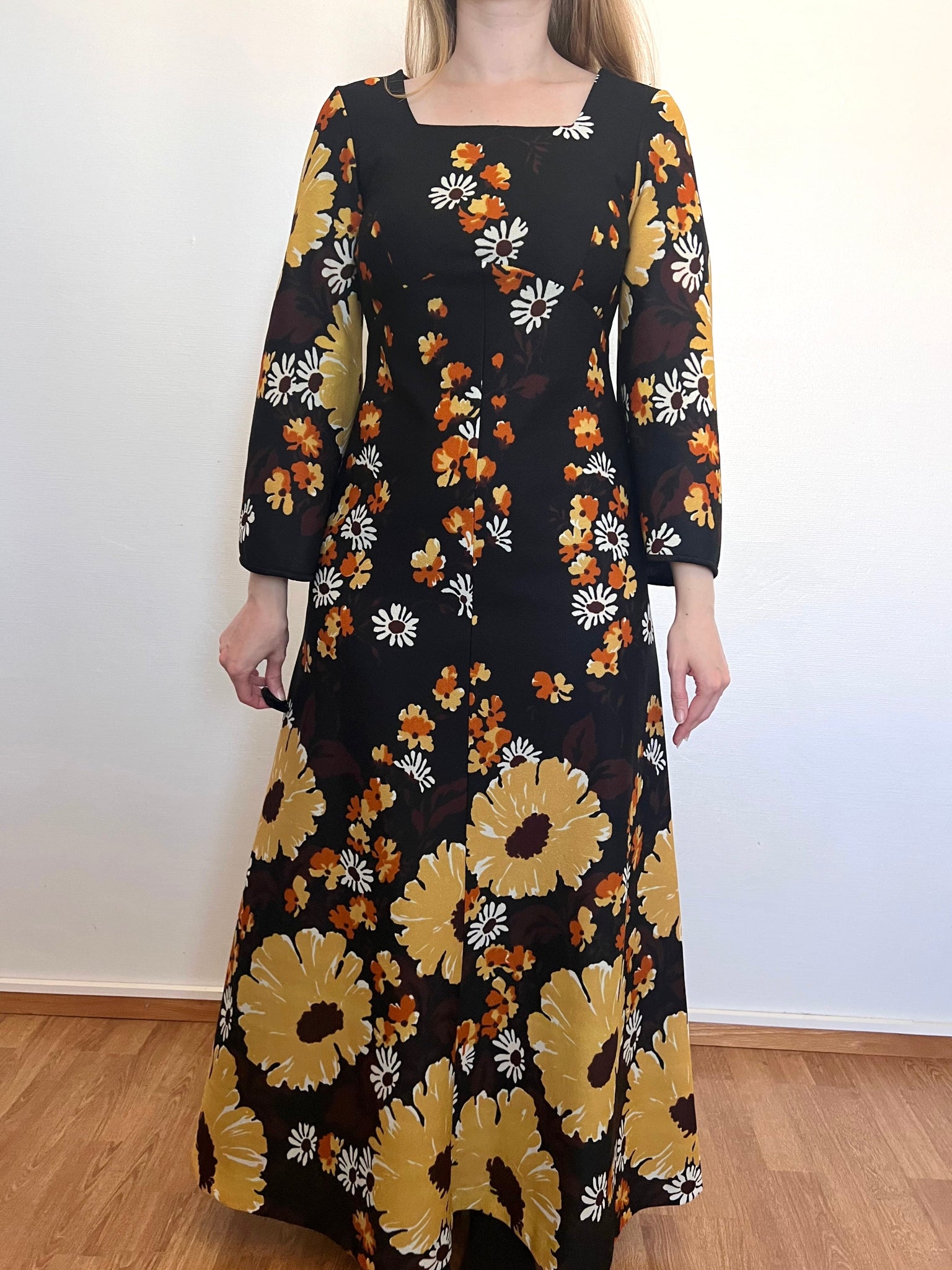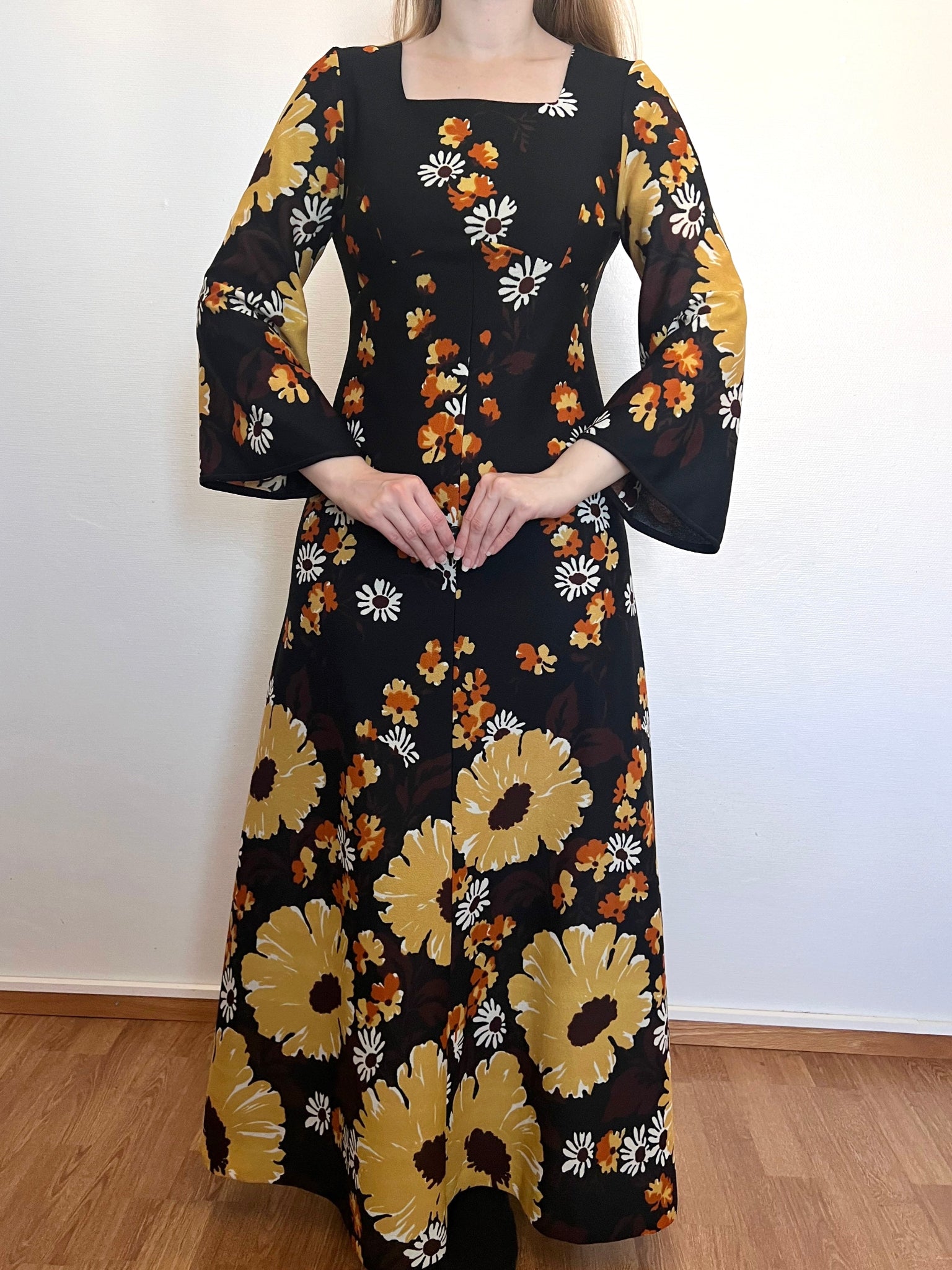A maxi dress with a square neckline, wide and flared sleeves. The fabric is black with a pattern of small and large flowers in yellow, orange and white. The cut is fitted through the bodice and waist before flowing out into a long skirt. The dress has a back zipper.