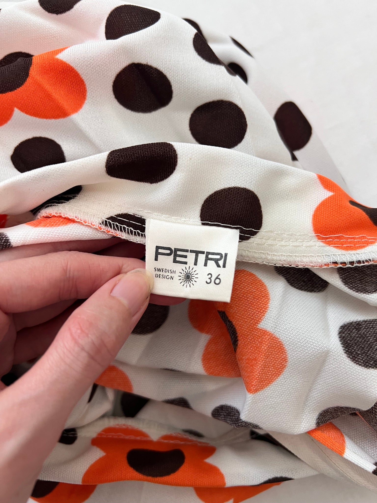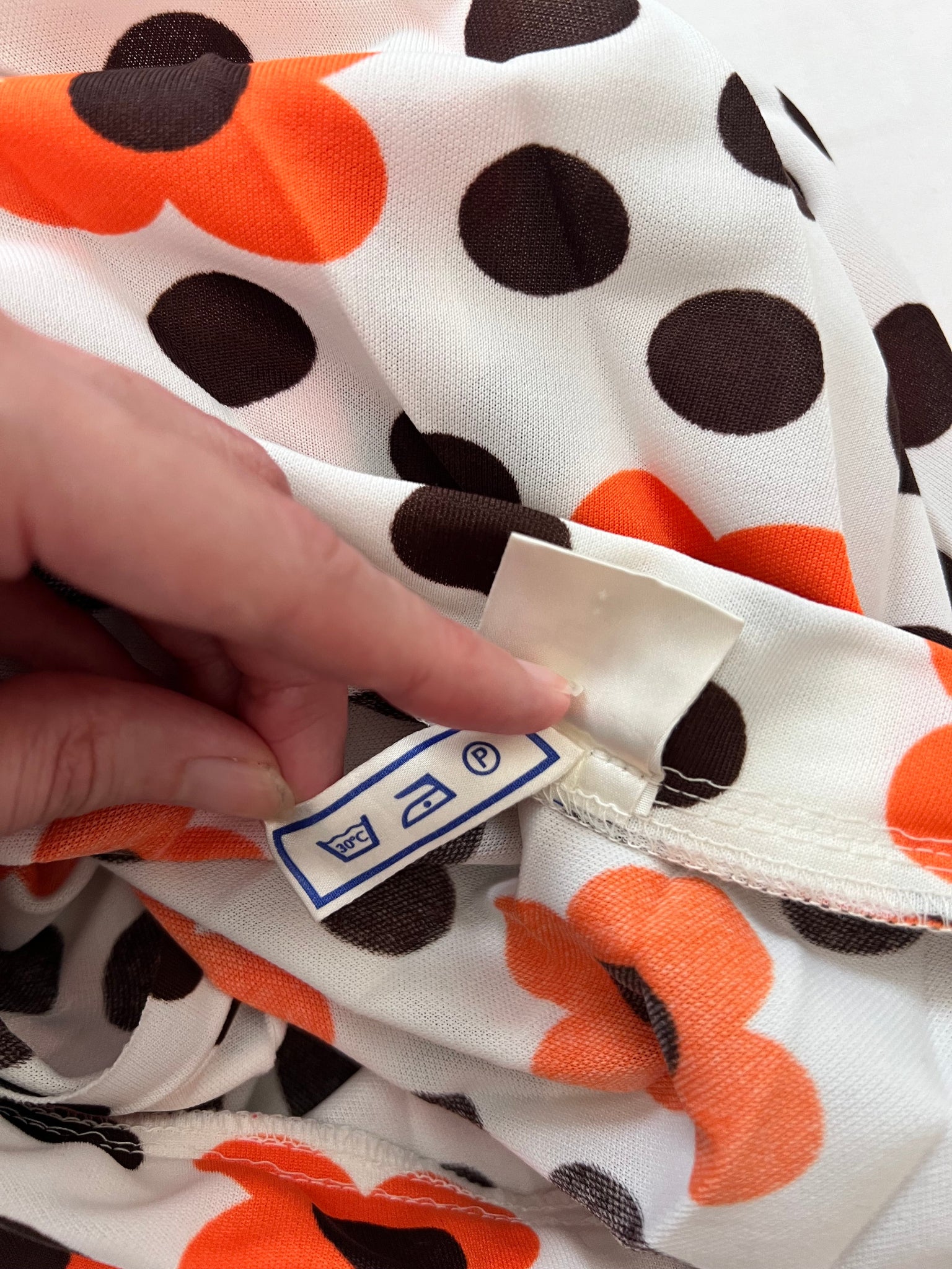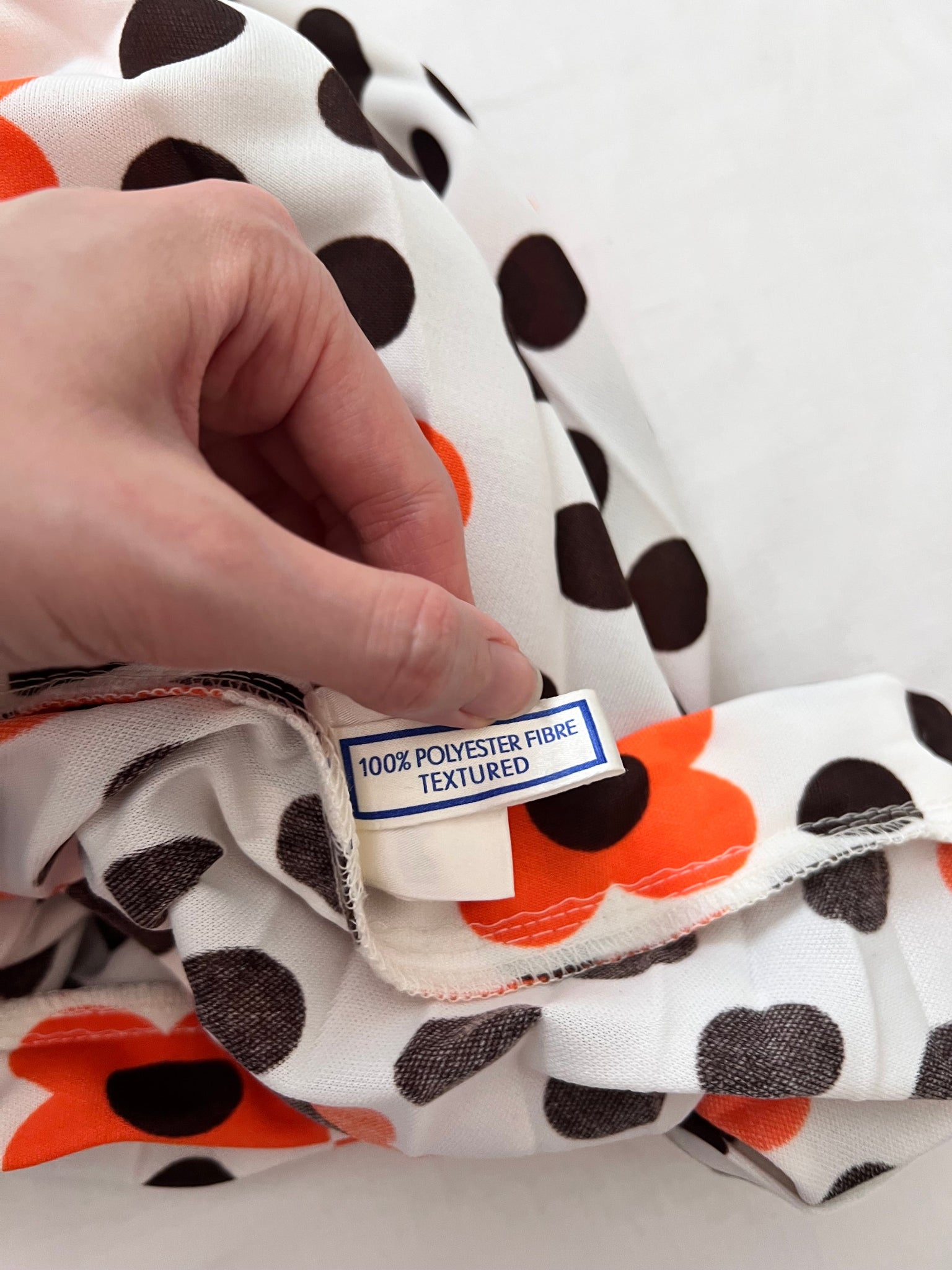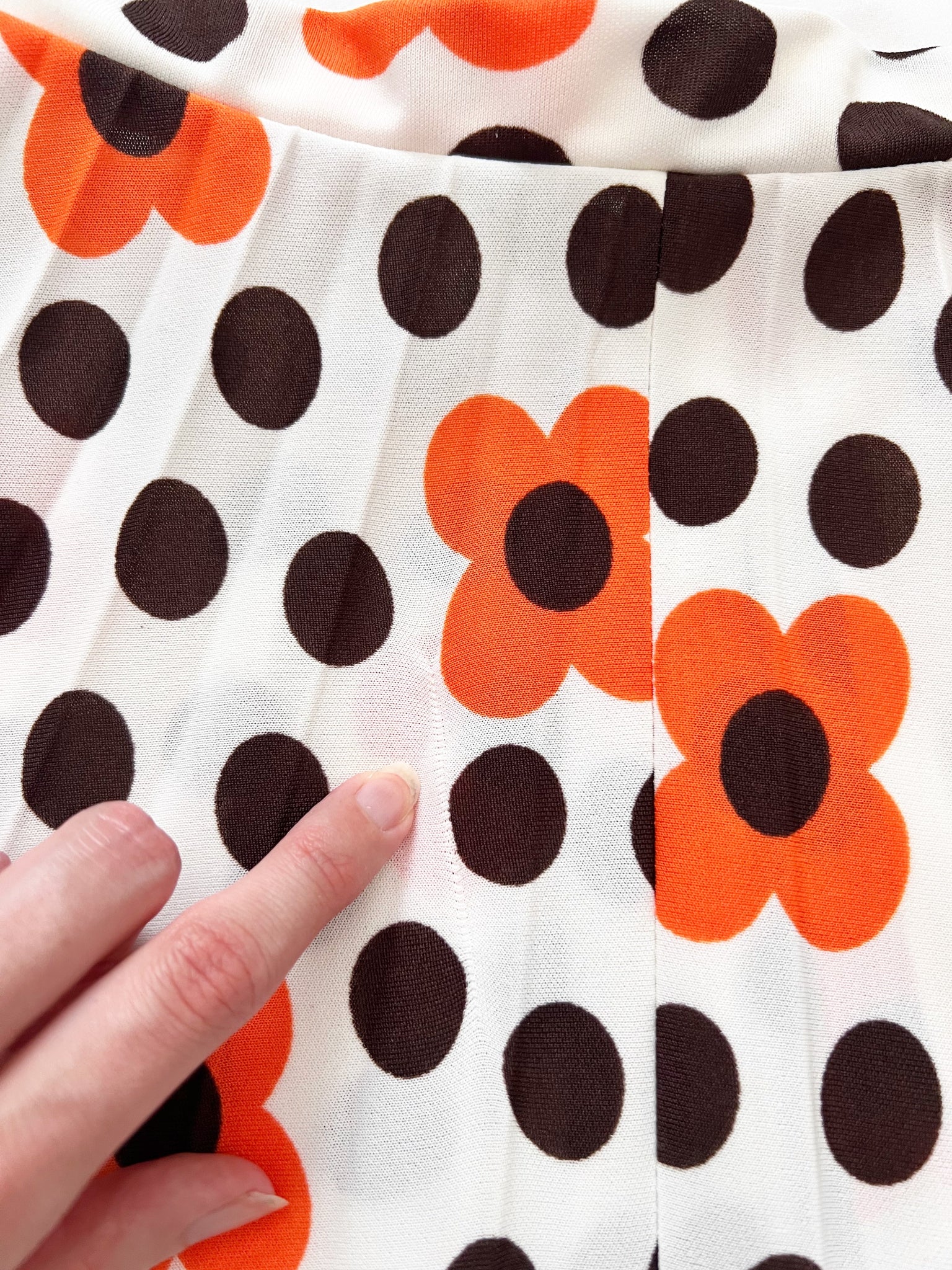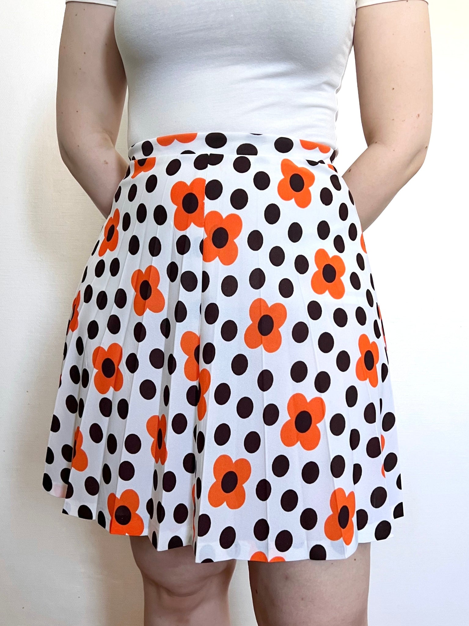 A pleated mini skirt with a white background and a pattern of orange flowers and brown polka dots. The skirt has a back zipper.