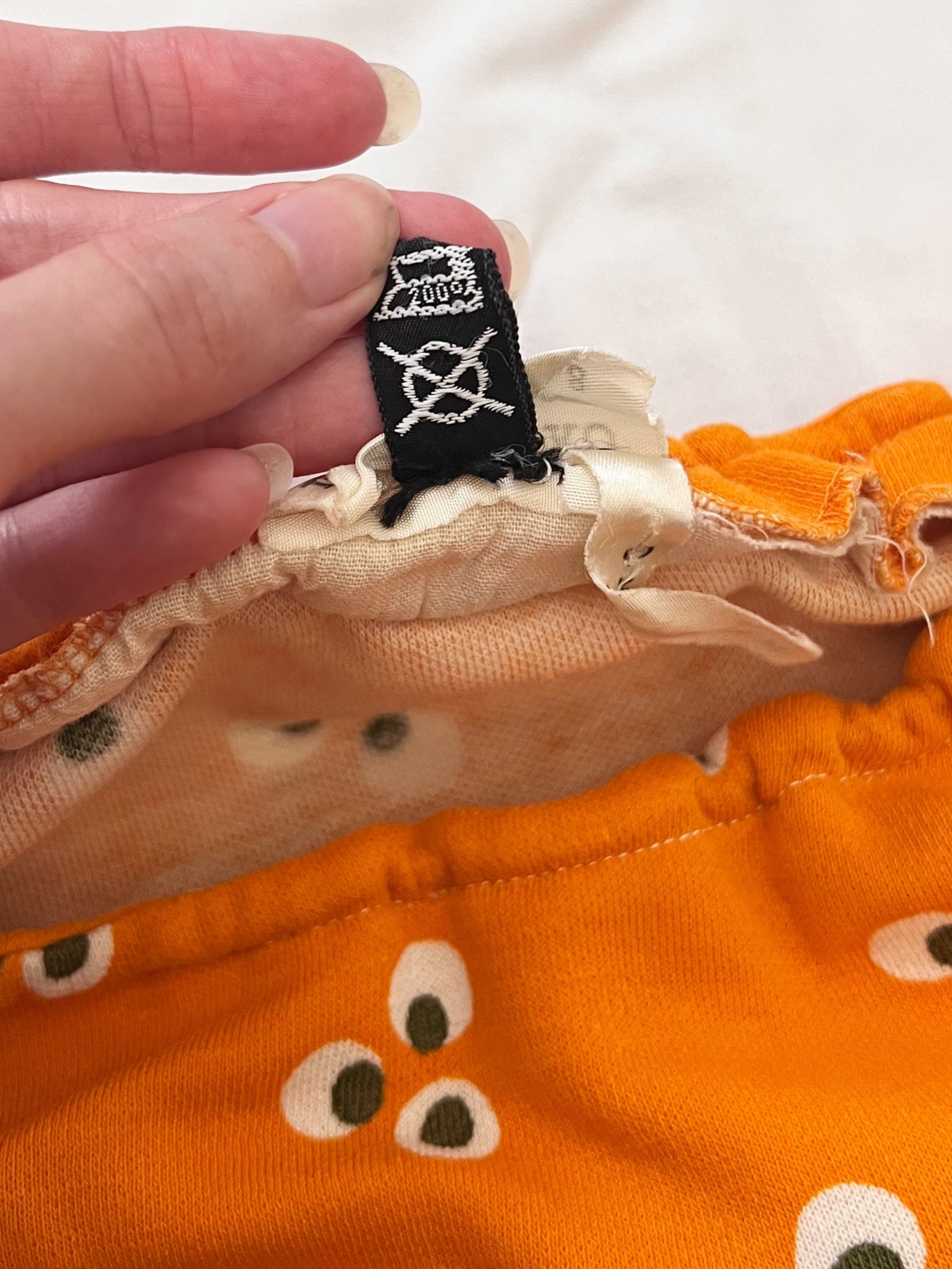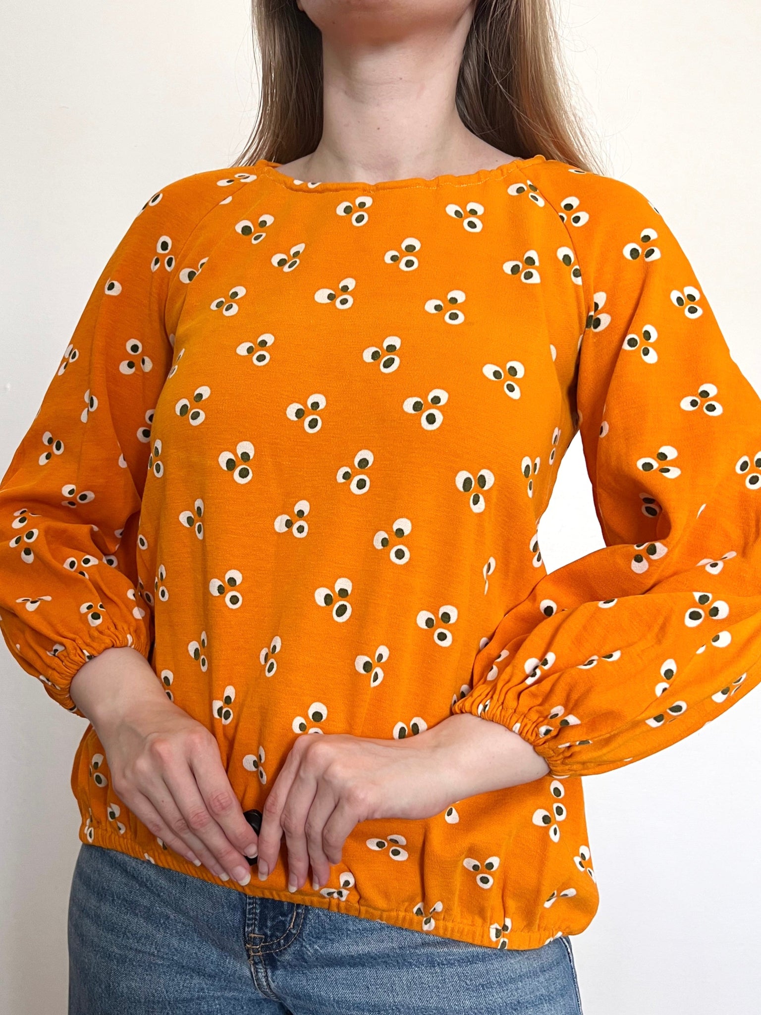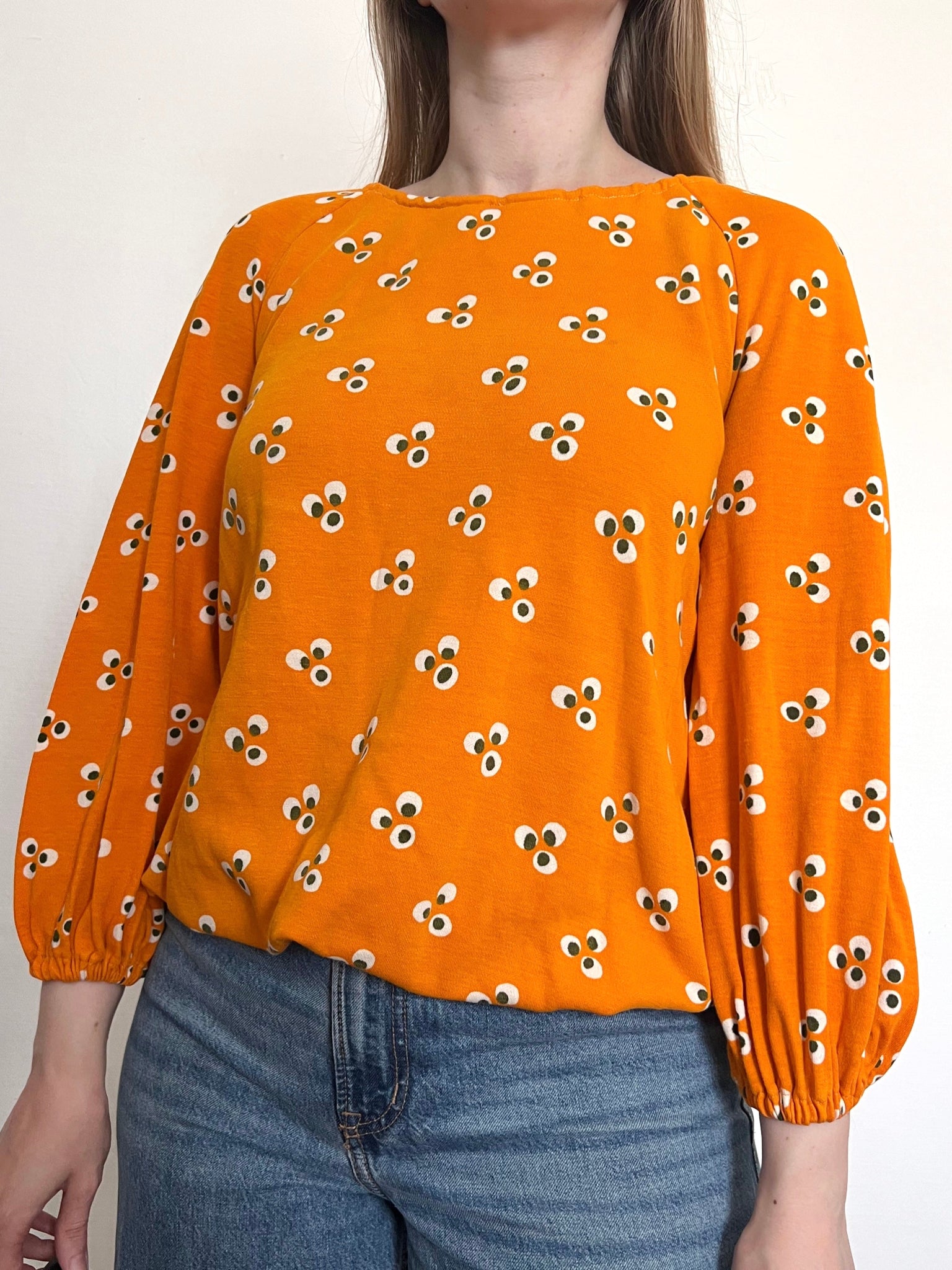 An orange Marimekko blouse from 1970 with a pattern of small clusters of three white ovals with black centers. The blouse has a round neckline, and a elasticized hemline.