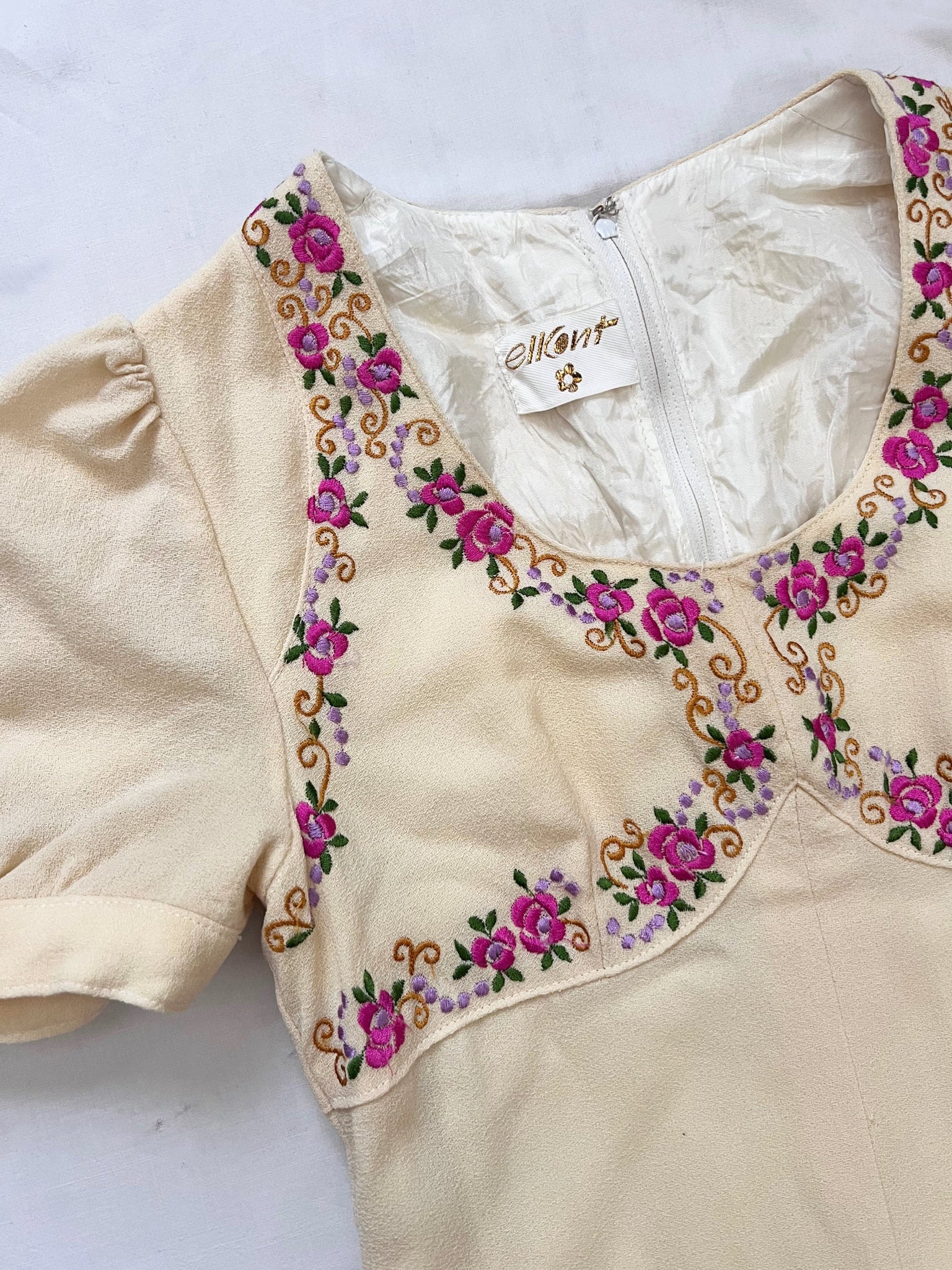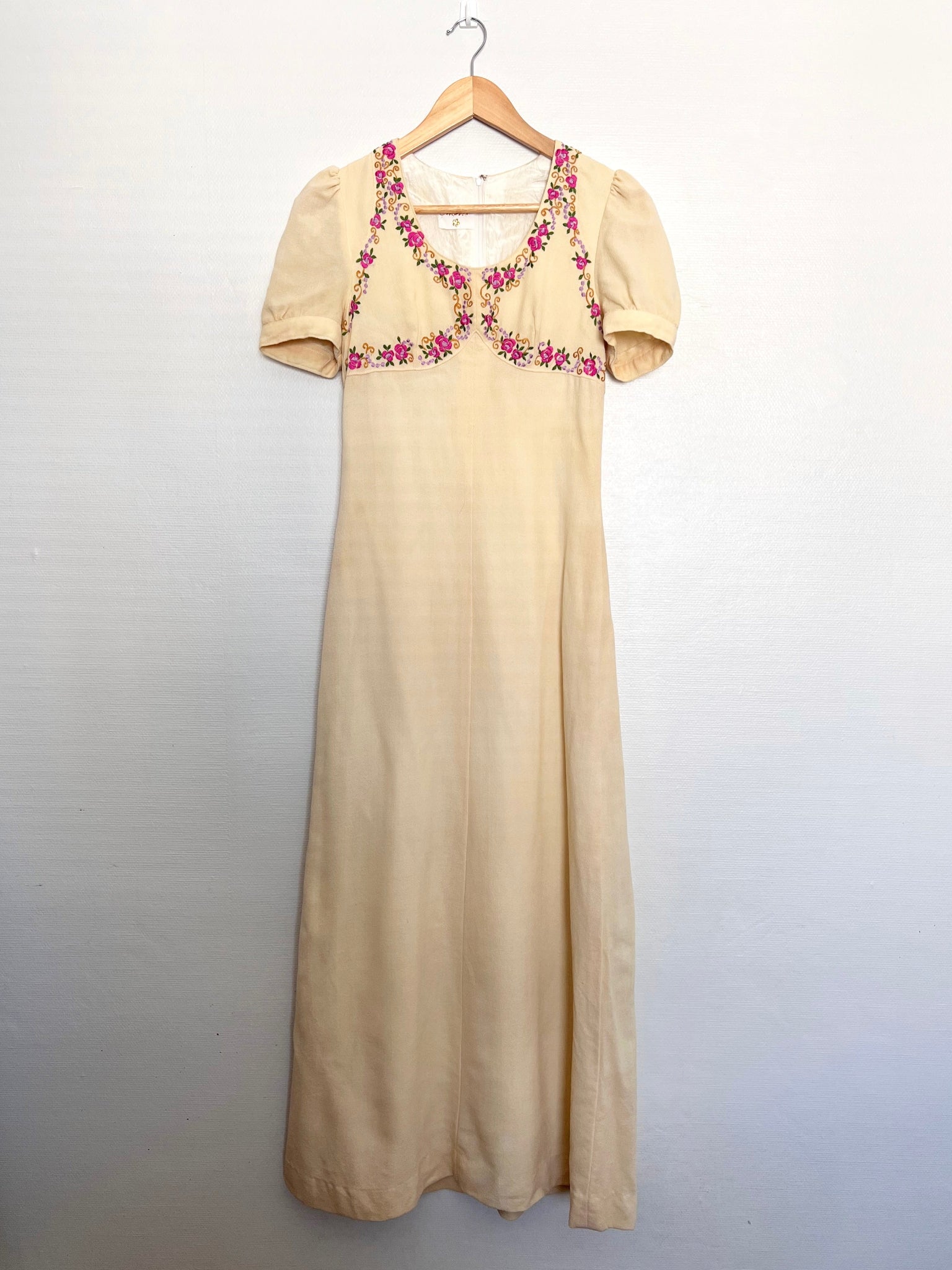 A light cream maxi flowing dress with short puffed sleeves and floral embroidery that at the neckline and upper bodice. The neckline is rounded with a subtle scoop, and the dress has a fitted bodice that flows into a slightly flared skirt.