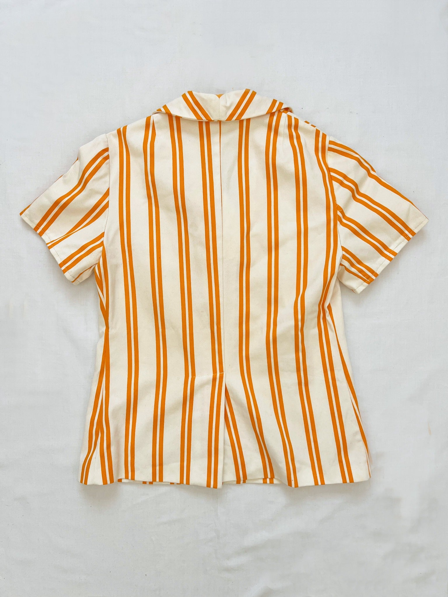 An orange and white striped t-shirt with a pointy collar, two fake front pockets, buttons that have the same stripes as the shirt, and a slit at the back.