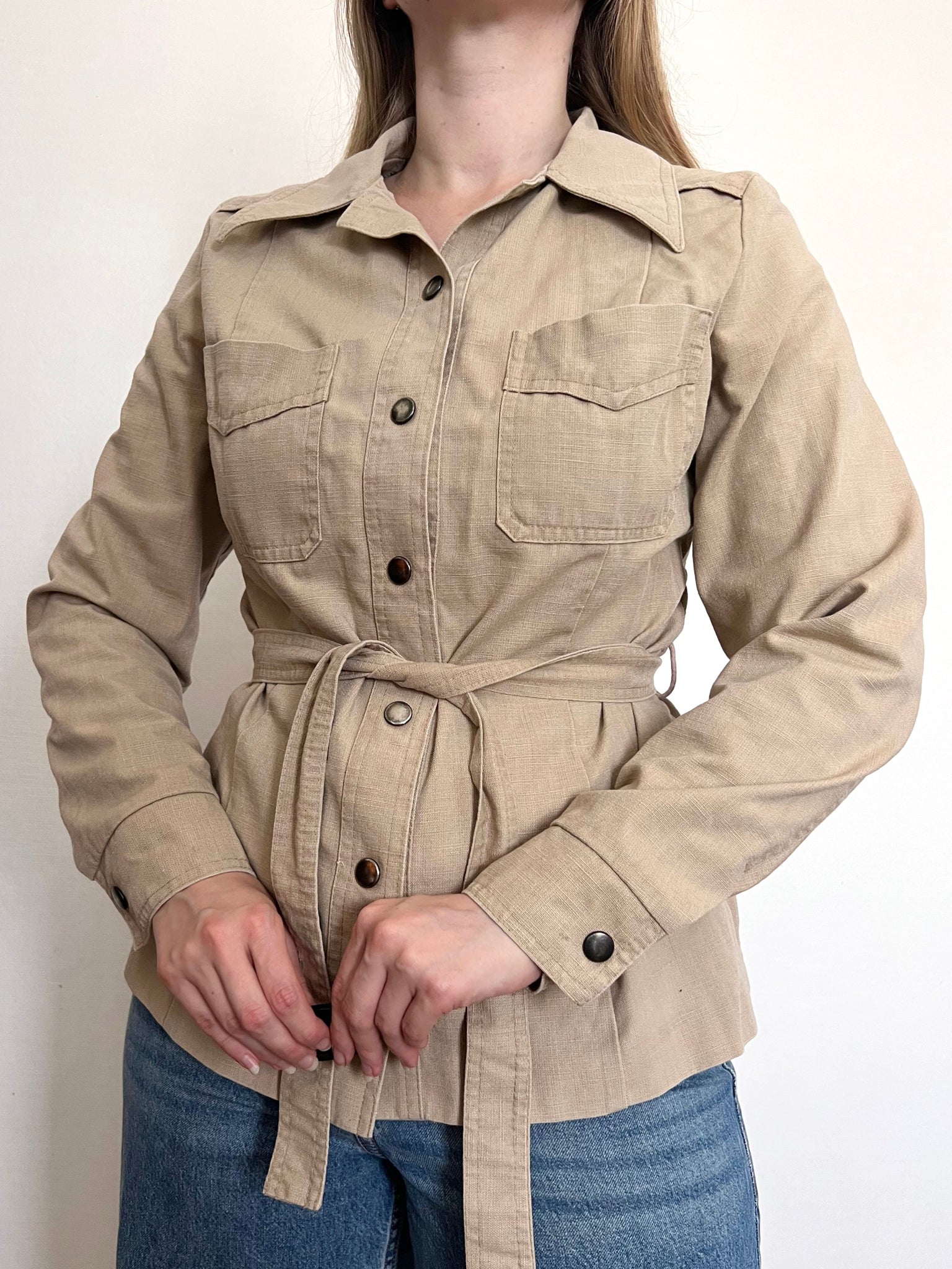 A beige trench short coat with metal buttons, a belt, and two front pockets.